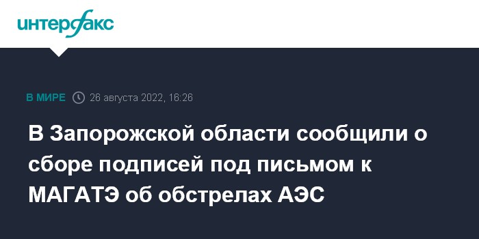 Москва. 26 августа. INTERFAX.RU - Жители Запорожской области начали сбор подписей под письмом к руководству Международного агентства по атомной энергии (МАГАТЭ) с требованием прекратить обстрелы Запорожской АЭС со стороны Вооруженных сил Украины, сообщили в администрации Энергодара.