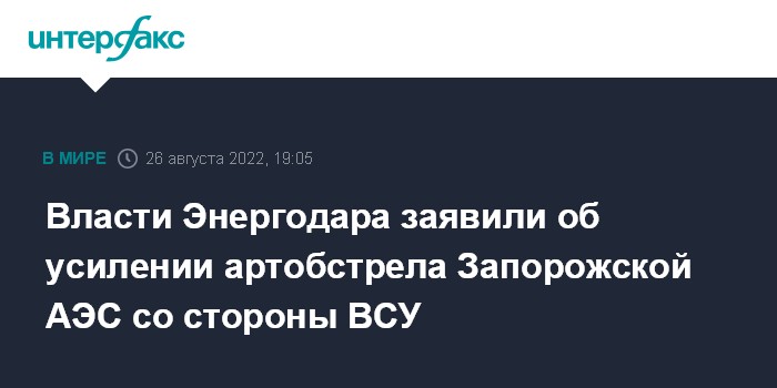 Москва. 26 августа. INTERFAX.RU - Вооруженные силы Украины усиливают артиллерийские обстрелы Запорожской АЭС в Энергодаре на подконтрольной РФ части Запорожской области, сообщили в городской администрации.