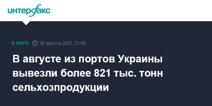 Как сообщалось, в Стамбуле 22 июля при участии ООН, России, Турции и Украины были подписаны два документа о создании коридора для вывоза зерна из трех портов на украинской территории – Черноморска, Одессы и Южного. Первое судно с 26 тыс. тонн кукурузы вышло из Одессы 1 августа.