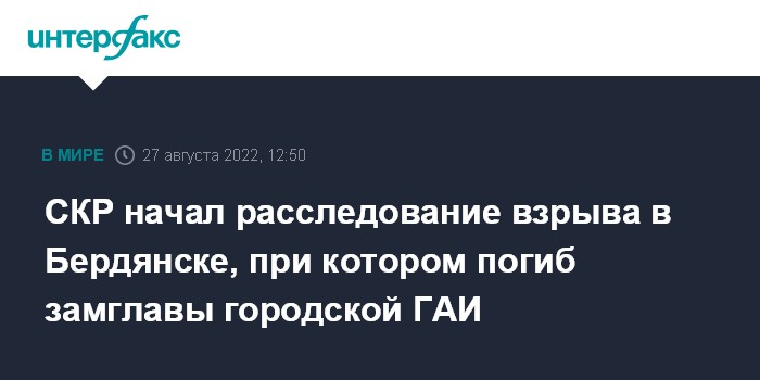 В пятницу, 26 августа, рядом с оздоровительным центром в Бердянске на подконтрольной РФ части Запорожской области, произошёл взрыв. Погиб замначальника ГАИ города Александр Колесников. Следствие полагает, что взрывное устройство было начинено поражающими элементами и закреплено на высоте более 3 м на дереве у забора оздоровительного центра "Криворожский горняк", где проживают беженцы из Мариуполя.