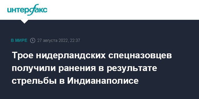 Москва. 27 августа. INTERFAX.RU - В результате стрельбы в субботу в городе Индианаполис (штат Индиана, США), пострадали трое солдат из Нидерландов, передает издание NL Times со ссылкой на нидерландское Минобороны.