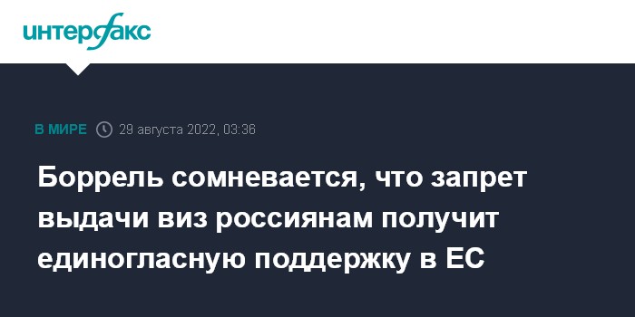 Москва. 29 августа. INTERFAX.RU - Верховный представитель ЕС по иностранным делам и политике безопасности Жозеп Боррель заявил, что на предстоящей встрече глав МИД стран Евросоюза маловероятна единогласная поддержка призыва запретить выдачу виз всем россиянам.