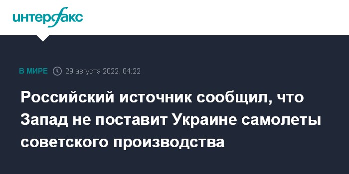 Москва. 29 августа. INTERFAX.RU - Российский военно-дипломатический источник сообщил, что Запад, скорее всего, не поставит Киеву боевые самолеты советского производства, при этом есть данные о наборе Пентагоном для Украины бывших афганских военных, в том числе летчиков.