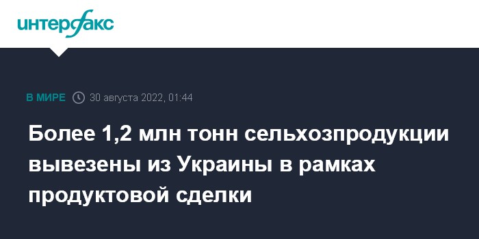 "По состоянию на 29 августа общий тоннаж зерна и других продуктов питания, экспортированных из трех украинских портов, составляет 1 289 065 тонн. Всего на данный момент было разрешено движение 122 судов - 67 прибывающих в украинские порты и 55 - выходящих из них", - отмечается в сообщении.