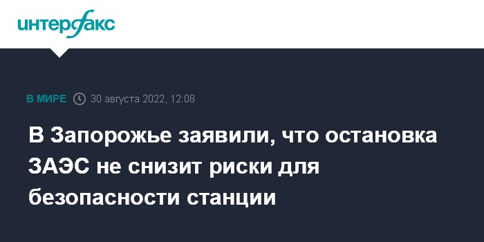 Москва. 30 августа. INTERFAX.RU - Возможная остановка реакторов Запорожской атомной электростанции (ЗАЭС) не позволит в полной мере обеспечить ее безопасность, считает член главного совета временной администрации Запорожской области Владимир Рогов.