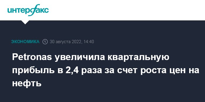 Москва. 30 августа. INTERFAX.RU - Малазийская нефтяная госкомпания Petroliam Nasional Bhd. (Petronas) во втором квартале 2022 года увеличила чистую прибыль в 2,4 раза благодаря росту цен на углеводороды.