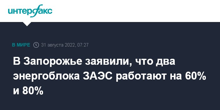 Москва. 31 августа. INTERFAX.RU - Два из шести энергоблоков АЭС в Энергодаре на подконтрольной РФ части Запорожской области работают на 60% и 80% своей мощности, поставки электроэнергии Украине продолжаются, сообщил "Интерфаксу" глава временной администрации региона Евгений Балицкий.