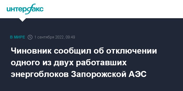 Москва. 1 сентября. INTERFAX.RU - На Запорожской АЭС работавший пятый энергоблок, по предварительной информации, отключился в четверг утром после срабатывания аварийной защиты в результате обстрелов, сообщил член главного совета временной администрации Запорожской области Владимир Рогов.