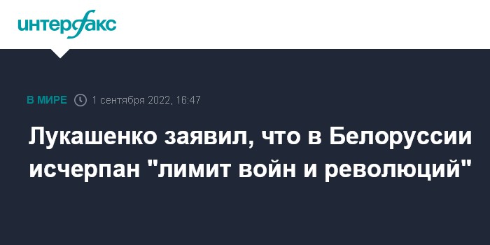 Москва. 1 сентября. INTERFAX.RU - Президент Белоруссии Александр Лукашенко заявил, что в республике исчерпан "лимит войн и революций". Он сказал это на открытом уроке во Дворце независимости в Минске.
