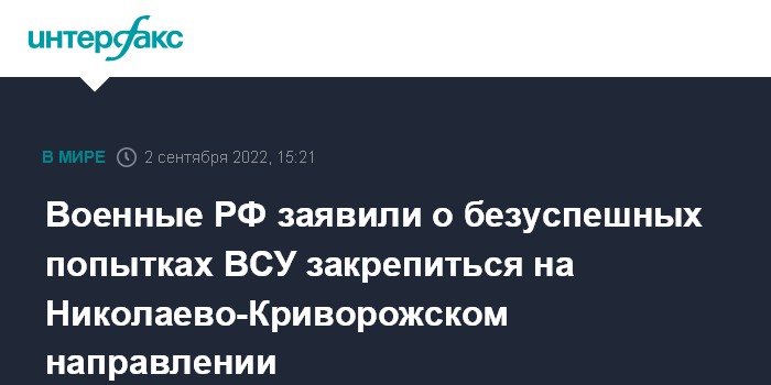 Москва. 2 сентября. INTERFAX.RU - Вооруженные силы Украины безуспешно пытаются закрепиться на отдельных участках на Николаево-Криворожском направлении, несут значительные потери, сообщил официальный представитель министерства обороны РФ Игорь Конашенков на брифинге в пятницу.