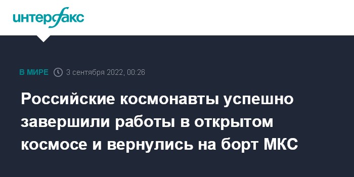 Москва. 3 сентября. INTERFAX.RU - Космонавты Олег Артемьев и Денис Матвеев завершили работы в открытом космосе и вернулись на борт Международной космической станции (МКС), следует из трансляции "Роскосмоса".