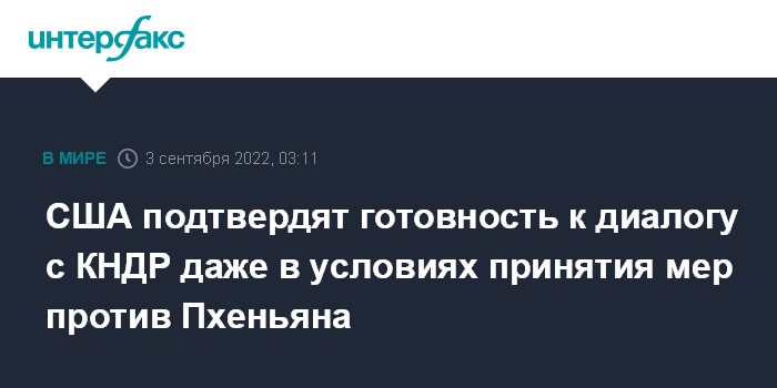Москва. 3 сентября. INTERFAX.RU - Специальный представитель США по КНДР Сон Ким на встрече со своими японским и южнокорейским коллегами подтвердит стремление Вашингтона к диалогу с Северной Кореей даже в условиях принятия против нее определенных мер, сообщил госдеп.