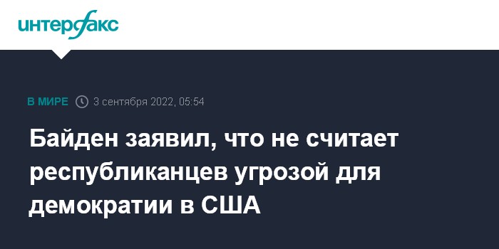 Москва. 3 сентября. INTERFAX.RU - Президент США Джо Байден на следующий день после того, как в своем обращении к нации назвал республиканцев-MAGA (сторонники бывшего президента Дональда Трампа, поддерживающих его лозунг: "Сделаем Америку снова великой!") опасностью для демократии, заявил, что не рассматривает их как угрозу для страны.