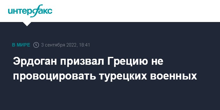 Москва. 3 сентября. INTERFAX.RU - Президент Турции Реджем Тайип Эрдоган предупредил Грецию о серьезных последствиях, если та будет провоцировать турецких военных.