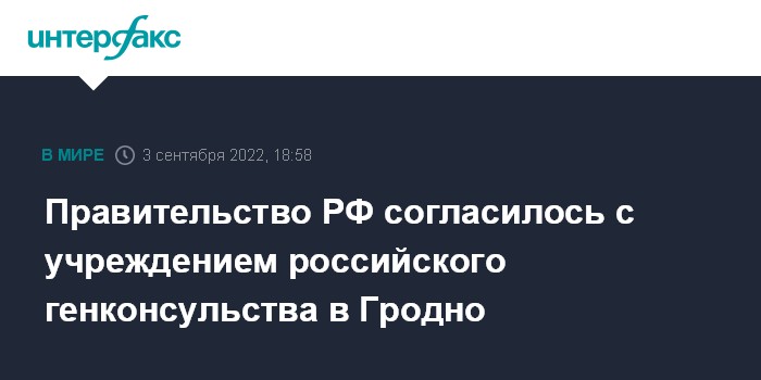 Москва. 3 сентября. INTERFAX.RU - Правительство России одобрило предложение МИД заключить соглашение об учреждении генерального консульства РФ в белорусском городе Гродно.