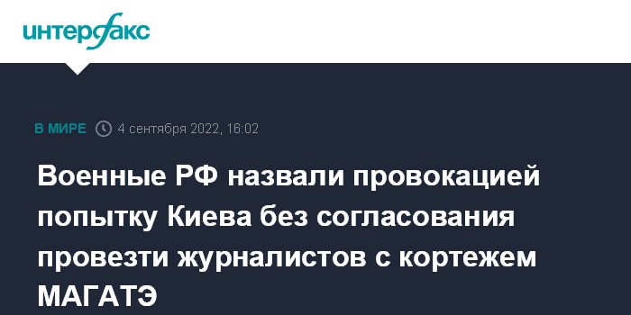 Минобороны РФ в своем заявлении назвало провокацией властей Украины попытку присоединить к кортежу МАГАТЭ, который ехал 1 сентября на ЗАЭС, автомобили с украинскими и западными журналистами без дополнительного согласования.