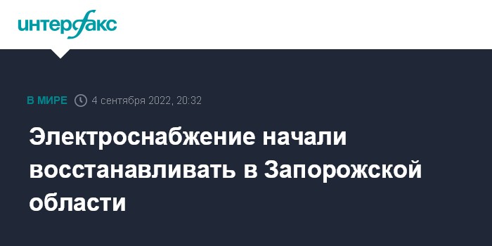 Москва. 4 сентября. INTERFAX.RU - Специалисты восстановили электроснабжение Мелитополя - административного центра подконтрольной РФ части Запорожской области, сообщил член главного совета администрации области Владимир Рогов.