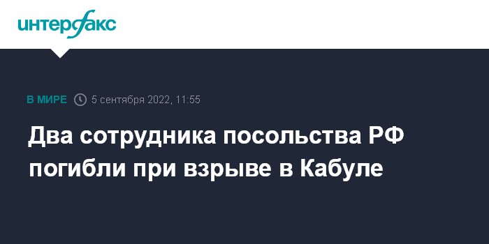 Москва. 5 сентября. INTERFAX.RU - В результате взрыва в районе посольства России в Кабуле погибли два сотрудника российской дипмиссии, заявили в понедельник в МИД РФ.