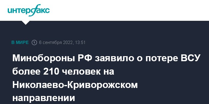 Москва. 6 сентября. INTERFAX.RU - Армия Украины за сутки потеряла более 210 человек при попытке атаки на Николаево-Криворожском направлении, сообщили в Минобороны РФ.