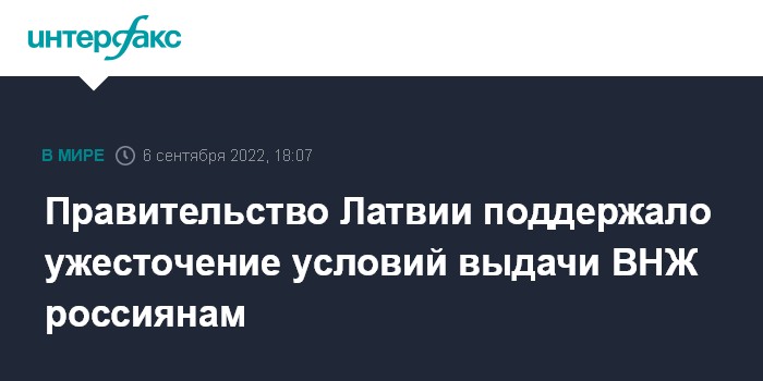 Москва. 6 сентября. INTERFAX.RU - Правительство Латвии во вторник поддержало изменения в закон об иммиграции, которые предусматривают ужесточение условий выдачи вида на жительство (ВНЖ) гражданам России и Белоруссии, передает агентство BNS.