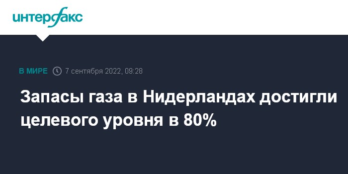 Москва. 7 сентября. INTERFAX.RU - Уровень запасов газа в подземных хранилищах на одном из ключевых рынков Европы – в Нидерландах – достиг целевого уровня в 80%. Кроме того, в начале сентября в голландский порт Эмсхавен прибыли две плавучих регазификационных установки для строящегося терминала СПГ (второго в стране), который должен заработать этой осенью. Эти события оказали стабилизирующее влияние на цены европейского рынка.