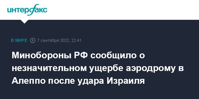 Москва. 7 сентября. INTERFAX.RU - В Минобороны РФ заявили, что в результате израильского удара 6 сентября крылатыми ракетами по аэродрому в сирийском городе Алеппо был причинен незначительный ущерб его инфраструктуре.