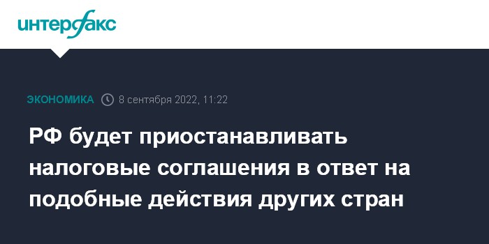 "Некоторые страны не хотят сотрудничать, приостанавливают действие соглашений об избежании двойного налогообложения с нами. Конечно, мы здесь тоже будем оперативно реагировать. Например, коллеги из Латвии приостановили действие соглашения. Чтобы в одностороннем порядке не предоставлять преференции по соглашению об избежании двойного налогообложения, мы также будем реагировать, оперативно будем приостанавливать соглашения, выходить с инициативами о денонсации соглашений", - сказал он.