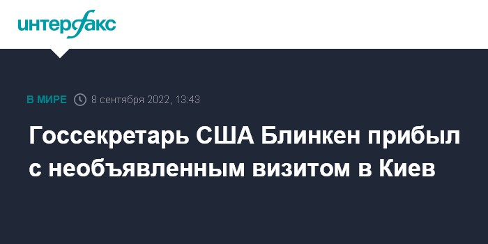 Москва. 8 сентября. INTERFAX.RU - Госсекретарь США Энтони Блинкен в четверг прибыл в Киев, причем о его визите до этого не сообщали, передает агентство Associated Press.