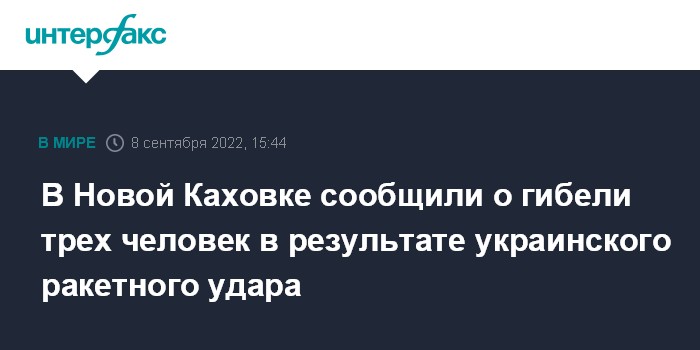Москва. 8 сентября. INTERFAX.RU - Украинские военные днем в четверг нанесли ракетный удар по центру города Новая Каховка в Херсонской области, погибли по меньшей мере три человека, сообщил "Интерфаксу" глава администрации города Владимир Леонтьев.
