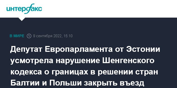 Депутат Европарламента от Эстонии усмотрела нарушение Шенгенского кодекса о границах в решении стран Балтии и Польши закрыть въезд гражданам РФ