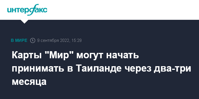 Москва. 9 сентября. INTERFAX.RU - В Таиланде активно идет работа, связанная с реализацией возможности использования карт "Мир" в стране российскими туристами, завершиться она может не ранее чем через два-три месяца, сообщила в пятницу исполнительный директор по Европе, Африке и Ближнему Востоку Управления по туризму страны (ТАТ) Титипорн Маненате.