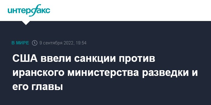 Москва. 9 сентября. INTERFAX.RU - США ввели ограничительные меры против министерства разведки и национальной безопасности Ирана и его главы – Сейеда Эсмаила Хатиба. Об этом говорится в заявлении американского Минфина, распространенном в пятницу.