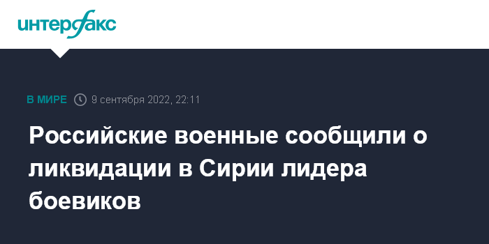 "По полученным данным, в результате удара ВКС России по лагерю боевиков в провинции Идлиб 8 сентября был ликвидирован лидер незаконного вооруженного формирования "Катиба Таухид валь-Джихад" Мухтаров Сирожиддин Зиявутдинович (позывной "Абу Салох"), причастный к организации террористических атак на правительственные силы и объекты гражданской инфраструктуры Сирии", - сообщил заместитель руководителя российского Центра по примирению враждующих сторон (ЦПВС) в САР Олег Егоров на брифинге в пятницу.