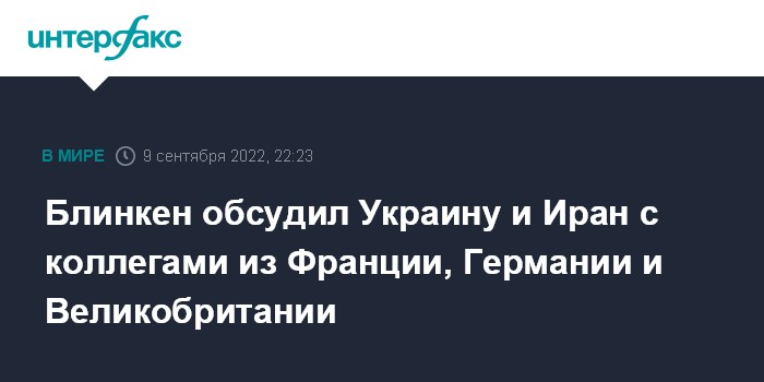 Москва. 9 сентября. INTERFAX.RU - Госсекретарь США Энтони Блинкен провел виртуальную встречу с коллегами из Франции, Германии и Великобритании, с которыми обсудил ситуацию на Украине и Иран.