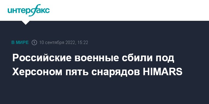 Москва. 10 сентября. INTERFAX.RU - Министерство обороны РФ заявило, что в Херсонской области российские военные сбили пять украинских снарядов реактивных систем залпового огня (РСЗО) HIMARS.
