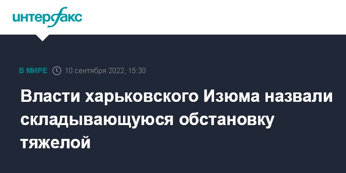 Москва. 10 сентября. INTERFAX.RU - Тяжелая обстановка складывается в Изюмском районе подконтрольной РФ части Харьковской области, сообщил глава администрации района Владислав Соколов.
