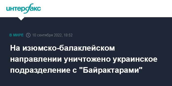 Москва. 10 сентября. INTERFAX.RU - Российская артиллерия из состава изюмско-балаклейской группировки уничтожила украинское подразделение с беспилотниками "Байрактар", сообщили в Минобороны РФ в субботу.