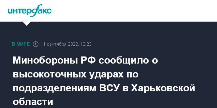 Москва. 11 сентября. INTERFAX.RU - Российские военные наносят высокоточные удары по подразделениям и резервам армии Украины в Харьковской области, заявили в воскресенье в Минобороны РФ.
