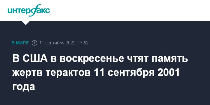Москва. 11 сентября. INTERFAX.RU - Памятные церемонии проходят в воскресенье в день 21-летней годовщины терактов в США: в Нью-Йорке, где стояли башни-близнецы Всемирного центра, у здания Пентагона и на месте падения самолета в Шанксвилле (штат Пенсильвания), сообщают американские СМИ.