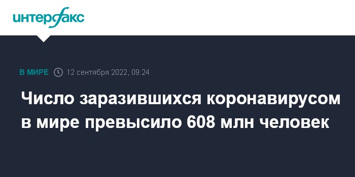 Москва. 12 сентября. INTERFAX.RU - Число подтвержденных случаев заражения коронавирусом в мире на утро понедельника достигло 608 610 078, свидетельствуют данные американского университета Джонса Хопкинса.