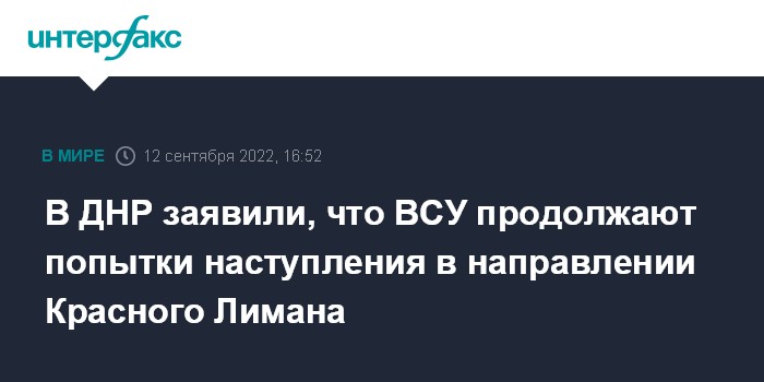 Москва. 12 сентября. INTERFAX.RU - Вооруженные силы Украины не оставляют попыток контрнаступления в направлении населенного пункта Красный Лиман на севере Донецкой народной республики, союзные силы держат ситуацию под контролем, заявил глава ДНР Денис Пушилин.