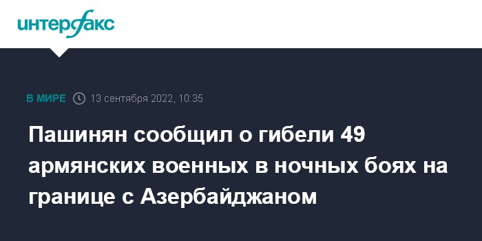 Москва. 13 сентября. INTERFAX.RU - Около 50 военнослужащих ВС Армении погибли в результате ночных боев с ВС Азербайджана, заявил премьер-министр Армении Никол Пашинян.