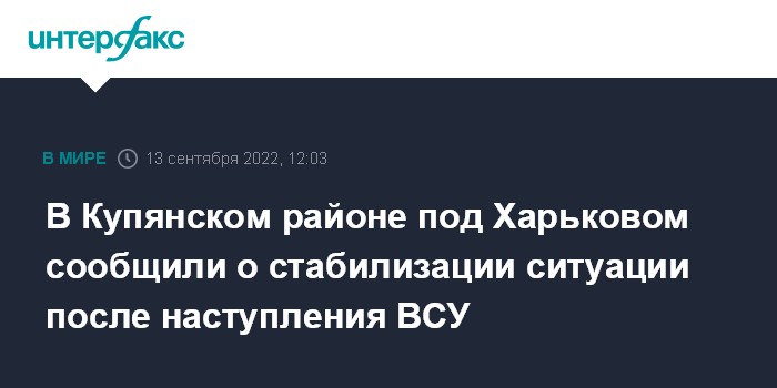 Москва. 13 сентября. INTERFAX.RU - Ситуация в Купянском районе Харьковской области стабилизирована после наступления украинских военных, линия фронта проходит по реке Оскол, сообщил глава районной администрации Максим Губин.