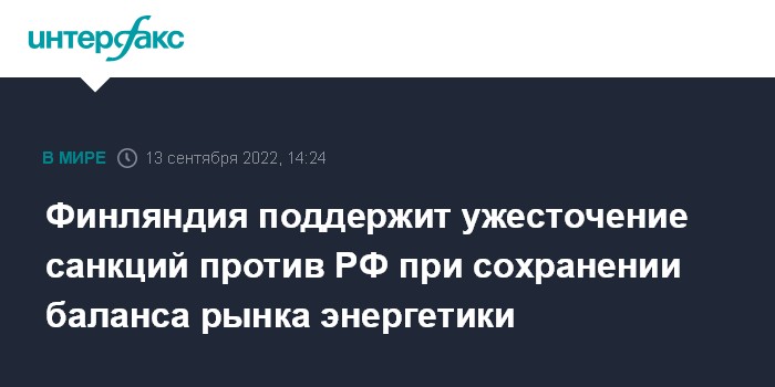 Москва. 13 сентября. INTERFAX.RU - Финляндия поддерживает санкции ЕС против России, включая энергетический сектор, и ожидает соответствующих предложений Еврокомиссии (ЕК), но не желает сбоев на европейском рынке энергии, заявила премьер-министр Финляндии Санна Марин.