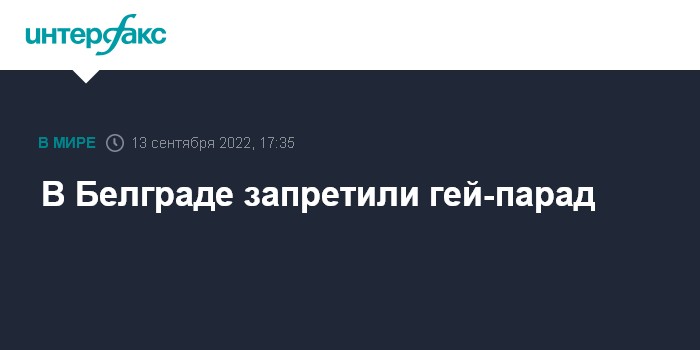 Москва. 13 сентября. INTERFAX.RU - МВД Сербии во вторник на основании закона об общественных выступлениях и в соответствии с конституцией страны решило запретить шествие участников белградского "Европрайда-2022", намеченного на 17 сентября, информирует сербский телеканал РТС.
