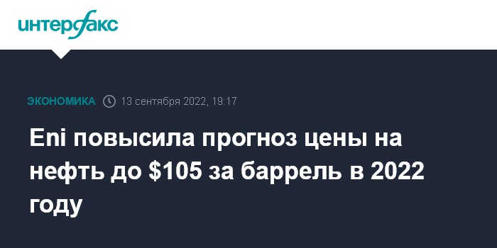 Москва. 13 сентября. INTERFAX.RU - Руководство Eni повысило прогноз базовой цены Brent в 2022 году с $80 до $105 за баррель и ухудшило прогноз по собственной добыче нефти и газа по итогам года.