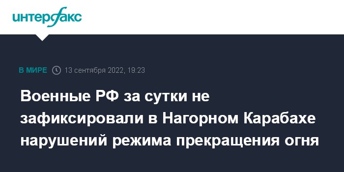 Москва. 13 сентября. INTERFAX.RU - В зоне ответственности российского миротворческого контингента в Нагорном Карабахе за прошедшие сутки не зафиксировано нарушений режима прекращения огня, сообщили в Минобороны РФ.