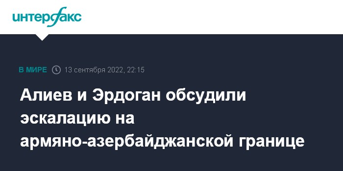 Москва. 13 сентября. INTERFAX.RU - Президенты Азербайджана и Турции Ильхам Алиев и Реджеп Тайип Эрдоган в ходе телефонного разговора во вторник обсудили ситуацию на армяно-азербайджанской границе, а также обменялись мнениями по будущим контактам.