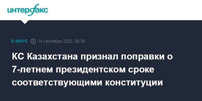 Москва. 14 сентября. INTERFAX.RU - Конституционный совет (КС) Казахстана, проверив проект поправок в конституцию, инициированных депутатами, установил, что предложения об установлении однократного семилетнего срока президентского мандата отвечают логике конституционных новелл, направленных на недопущение монополизации государственной власти.