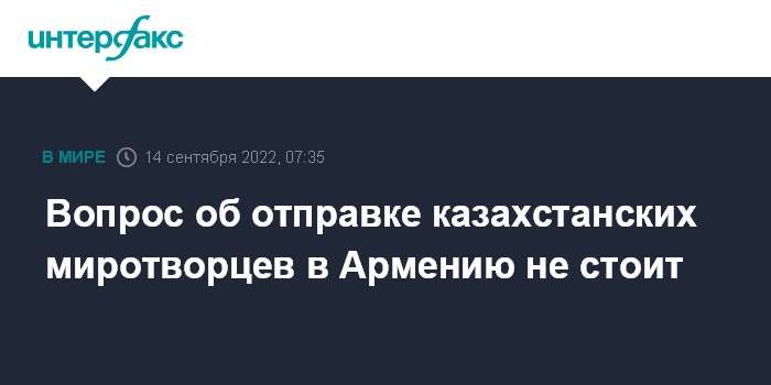 Москва. 14 сентября. INTERFAX.RU - Вопрос об отправке миротворцев из Казахстана в Армению в связи с обострившейся ситуацией на армяно-азербайджанской границе не стоит, сообщил министр иностранных дел Казахстана Мухтар Тлеуберди.